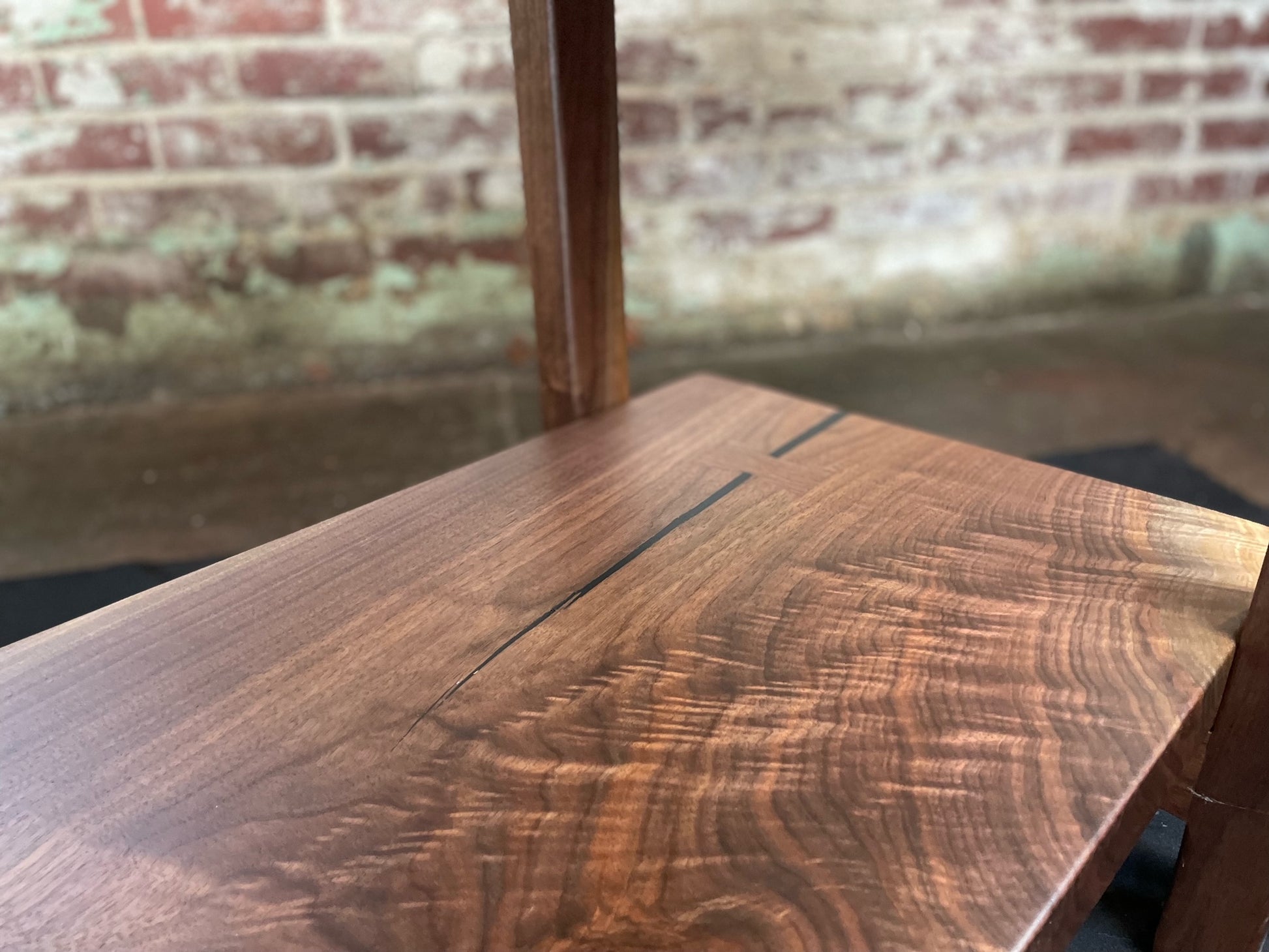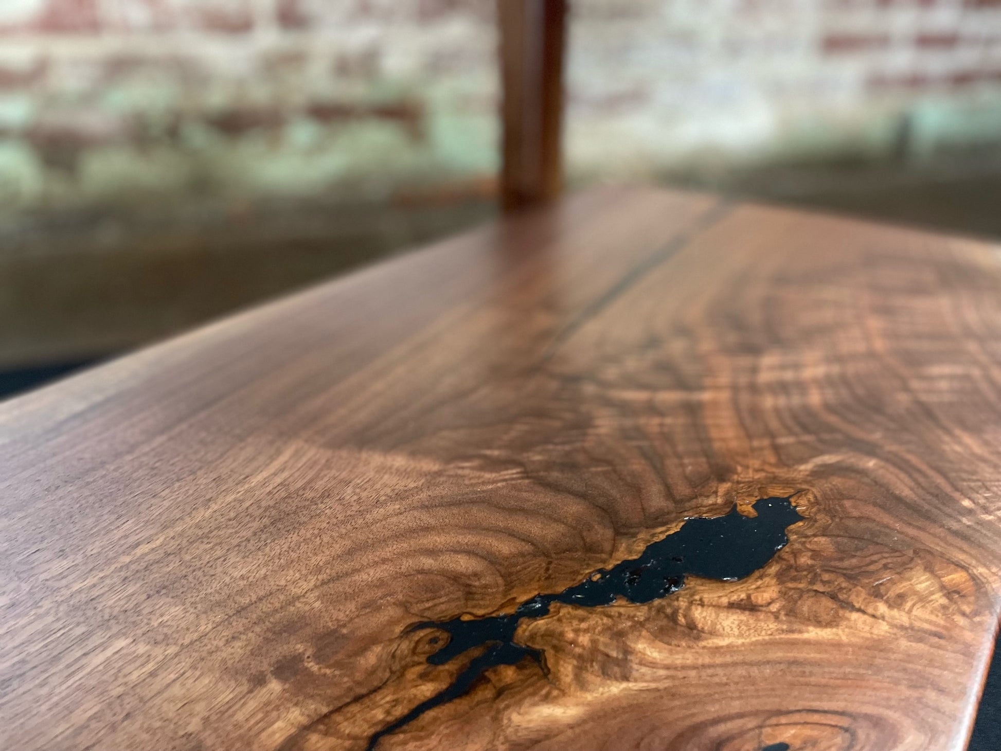 This console table is a gorgeous piece of black walnut, paired with a custom epoxy finish. Until the light illuminates the epoxy, it appears black. Once the lighting is right, the deep purple flake flashes its beautiful color. Woodrich creates low carbon footprint furniture and utilizes repurposed wood for its artwork!