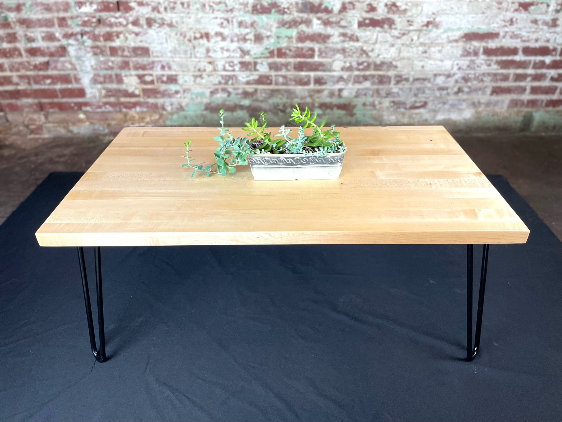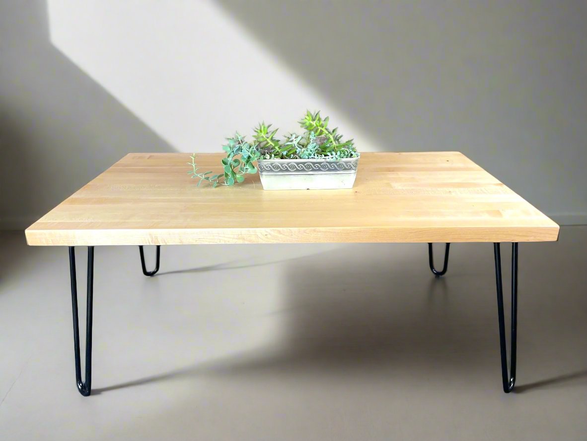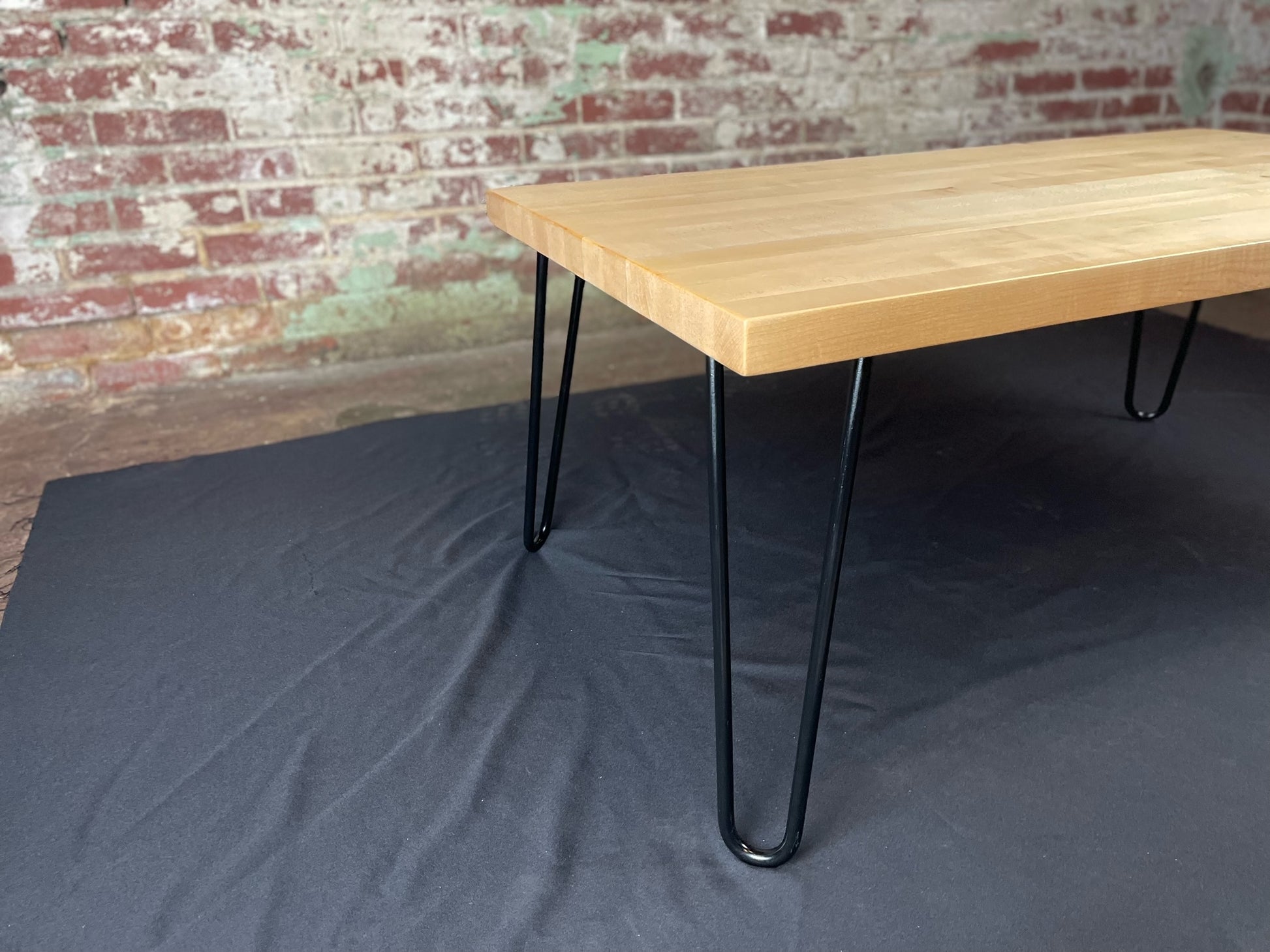 Woodrich has designed the coffee table that belongs in any room, the Minimalist Coffee Table. Clean cut, sturdy, and modern. This piece is garnished by hairpin legs, made with American steel, right here at our woodshop! We also offer a flow leg design (second base pictured), powder coated black! Please email us with any questions or requests you may have!
